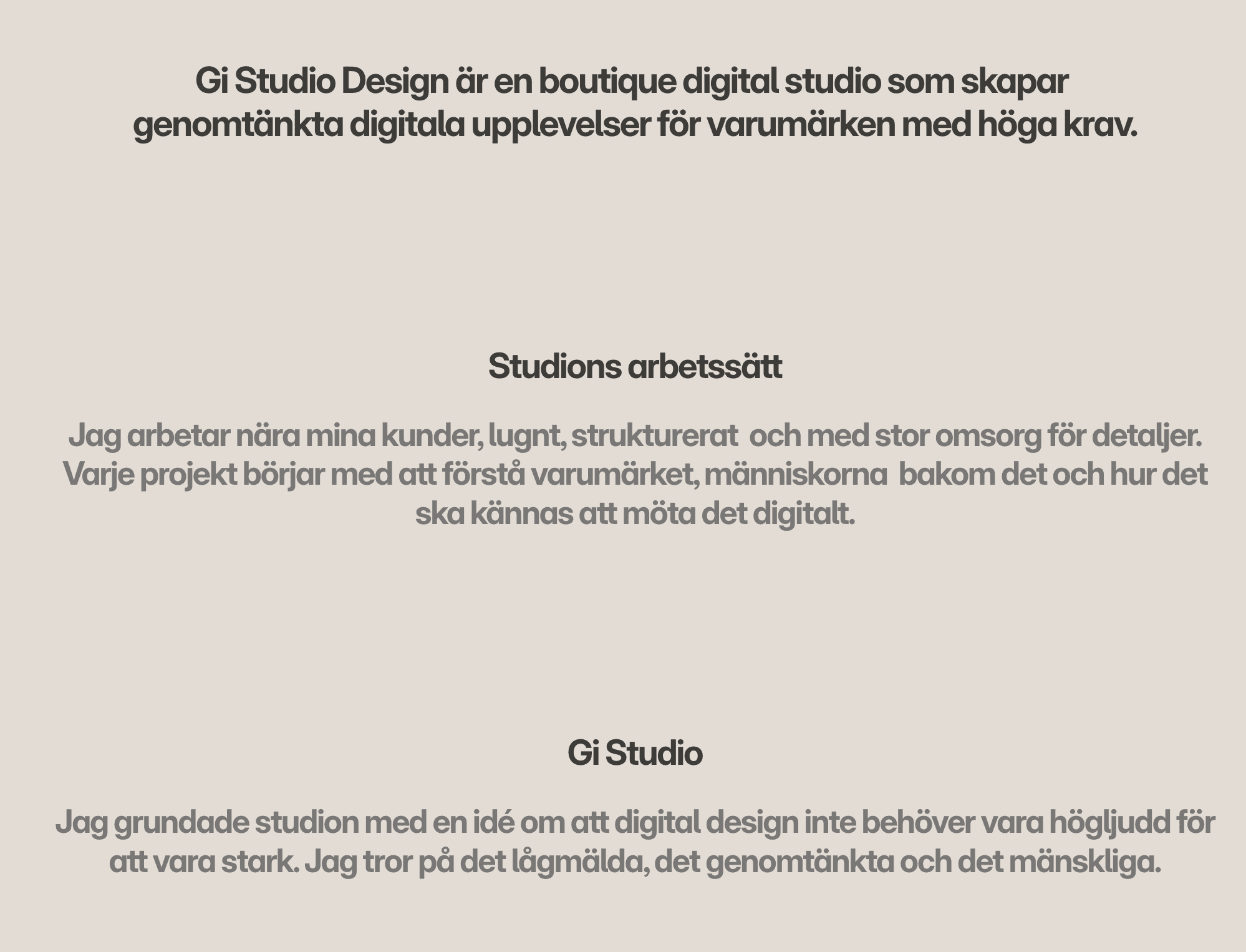 GI Studio Designär min egna designstudio där jag hjälper företag att skapa digitala upplevelser som fungerar. Projektet innebar att bygga hela varumärket och den digitala närvaron från grunden. En process som lärde mig enormt mycket om att tänka strategiskt kring design.