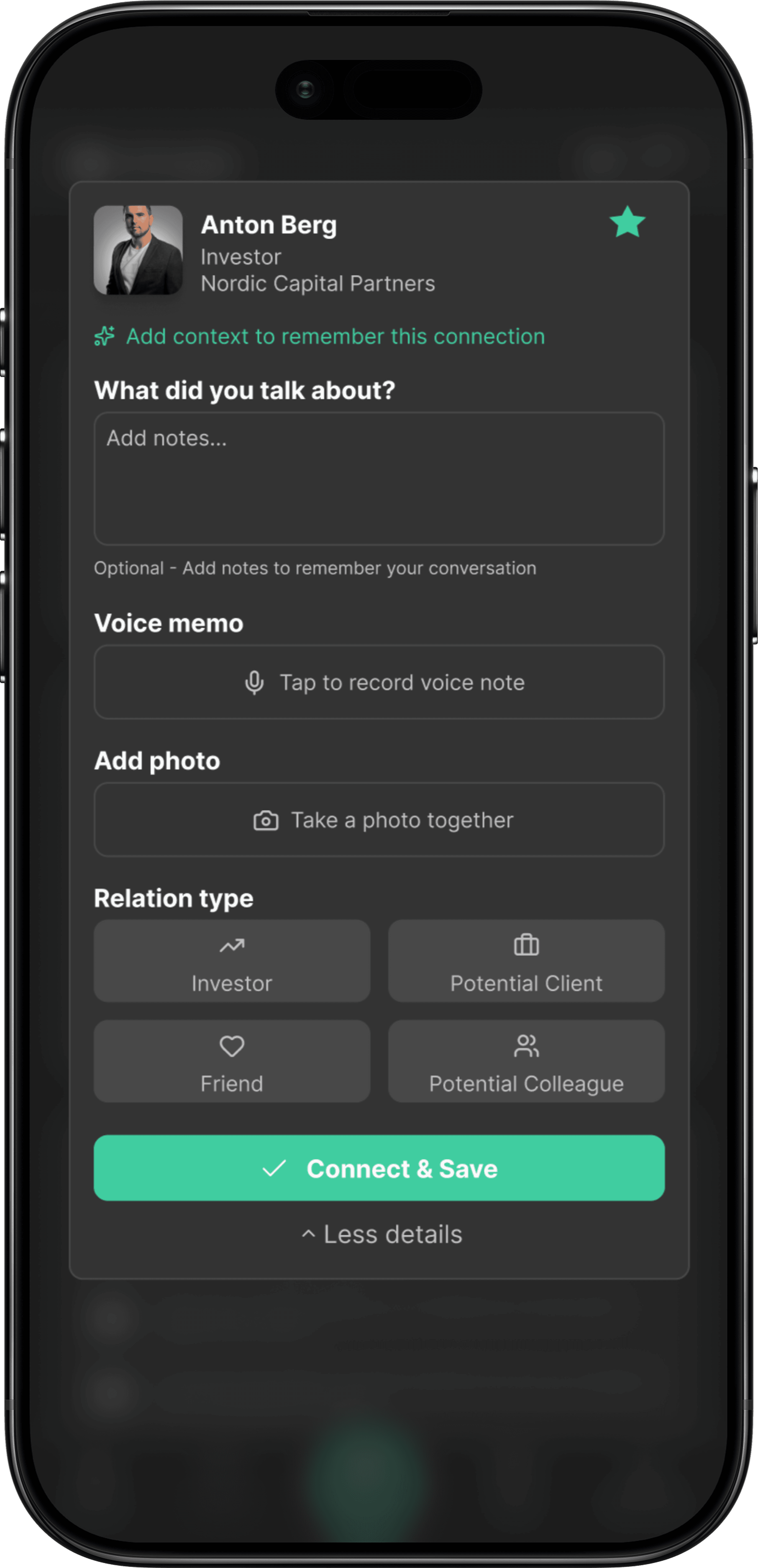 Utifrån insikterna har vi tagit fram koncept som fokuserar på värdet mellan event. Jag har varit med och utvecklat wireframes och prototyper som syftar till att bevara kontext från mötet, hjälpa användaren att minnas varför en kontakt var relevant och göra uppföljning enkel och trygg.
